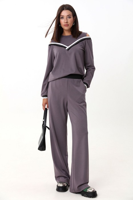 Комплект 2-ка, состоящий из джемпера и брюк. Джемпер свободного объёма, оригинального кроя, с имитацией топа и открытыми плечами. Горловина круглая, по спинке застежка на петлю и пуговицу Отделка горловины джемпера и манжеты выполнены из довязов в контрастном цвете. Брюки прямого силуэта на эластичной резинке по талии.
