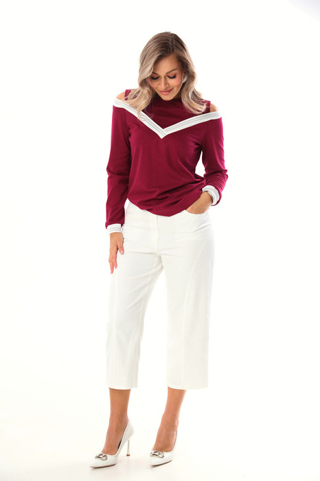 Комплект 2ка, состоящий из джемпера и брюк. Джемпер свободного объёма, оригинального кроя, с имитацией топа и открытыми плечами. Горловина круглая, по спинке застежка на петлю и пуговицу. Отделка горловины джемпера и манжеты выполнены из довязов в контрастном цвете.  Брюки капри, зауженные к низу, выполнены из джинсовой ткани. По переду и сзади расположены карманы. Застежка на пуговицу и молнию.