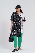 Комплект 2ка, состоящий из жакета и брюк. Жакет на подкладке с объёмными рукавами. Перед выполнен на запах с застежкой на кнопки, под пояс по талии. Широкие брюки-кюлоты свободного оригинального кроя с застёжкой на пуговицы. Без карманов.