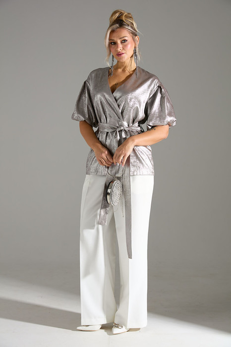 Комплект 2ка, состоящий из жакета и брюк. Легкий жакет на подкладке с объёмными рукавами. Перед на запах с застежкой на кнопки, под пояс по талии.