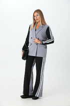 Комплект 2ка, состоящий из жакета и брюк. Жакет двубортный свободного объёма с застёжкой на пуговицы. По бокам расположены функциональные прорезные карманы с клапаном. Рукава жакета выполнены из отделочной ткани. Пере и спинка жакета на подкладке. Брюки прямого силуэта свободного кроя выполнены из ткани двух видов, по талии вставлена эластичная резинка.