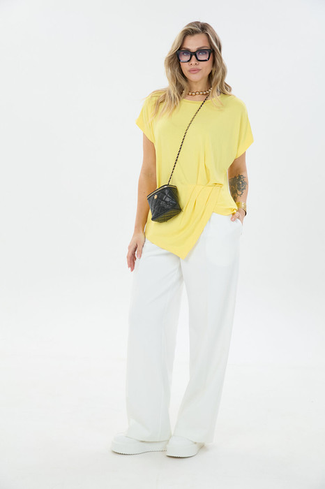 Комплект 2ка состоит из джемпера и брюк. Лёгкий джемпер свободного силуэта с короткими цельнокроеными рукавами и оригинальным кроем. Низ джемпера ассиметричный.Брюки из джинсовой ткани свободного объёма от бедра с застёжкой на молнию и пуговицу. По переду и сзади расположены карманы.