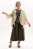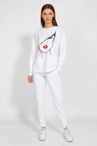 Костюм 2ка, состоящий из джемпера и брюк. Джемпер на молнии свободного силуэта из ткани двух видов. Рукава цельнокроеные чуть ниже локтя с имитацией манжеты. Джемпер облегченный, без подкладки и карманов, по низу на резинке. Брюки широкого объема, прямого силуэта. В боковых швах расположены карманы с наклонным входом. Застежка-гульфик. Пояс отрезной, притачной. В задней части пояса вставлена эластичная тесьма (резинка). Пояс застегивается на петлю и крючок.