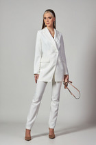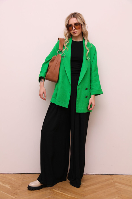 Комплект 2ка, состоящий из жакет и брюк. Жакет большого объёма с двубортной застежкой по одной стороне на петли и пуговицы. Рукава 3/4 с манжетами. Жакет без подкладки. По переду расположены накрадные карманы. Брюки широкого объема. По центру переда заложены две широкие встречные складки на каждой половинке. В боковых швах расположены карманы с наклонным входом. Талия на резинке.