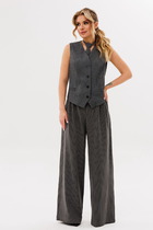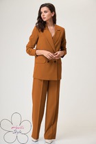 Костюм 2ка, состоящий из трикотажной блузки и брюк. Блузка свободного силуэта с V-образным вырезом горловины. Рукав блузки цельнокроеный. Ниже линии груди вставлена эластичная резинка. Брюки прямого силуэта с резинкой по талии.