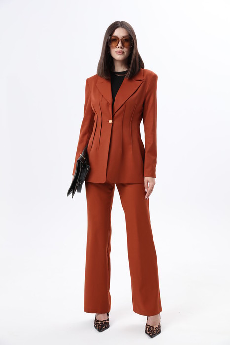 Костюм 2ка, состоящий из жакета и брюк. Жакет однобортный умеренного объема, приталенного силуэта. Силуэт изделия создается за счет отрезных бочков на спинке и полочке, а также за счет среднего шва и плечевых вытачек на спинке. На полочке нагрудная вытачка переведена в плечевой шов. Плечевой пояс расширен и поддерживается плечевыми накладками. Рукав втачной, длинный, двухшовный. Воротник отложной с отрезной стойкой, пиджачного типа. Застежка на уровне линии талии на одну петлю и пуговицу. Жакет полностью обработан притачной подкладкой. Длина изделия до середины бедер. Женские брюки малого объема, прямого силуэта. На передних половинках с обеих сторон расположены под наклоном нефункциональные прорезные карманы в рамку. На задних половинках расположены вытачки. Пояс отрезной. На поясе расположены шлевки. Застежка брюк – гульфик на молнии, на поясе крючок. Рост фотомодели 175 см. Размер у фотомодели – 44. СОВЕТ ОТ СТИЛИСТА:для добавления "остроты" образу советуем прием "total look" в одном цвете и носить костюм с блузкой ВИ 1631. А для стильного базового образа сочетайте с облегающей трикотажной майкой и не забудьте обязательно добавить украшения, например серьги и простое ожерелье. Из обуви могут быть лодочки на каблуке или лоферы на платформе. Не бойтесь обуви на плоском ходу-лекала брюк идеально удлиняют ноги.