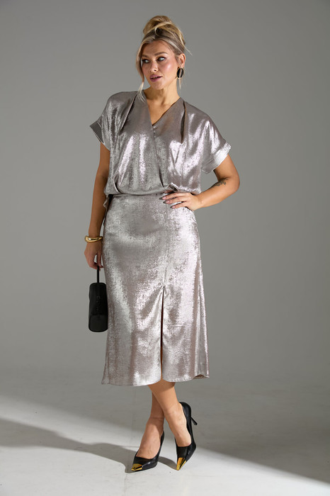 Комплект 2ка, состоящий из блузки и юбки. Блузка свободного силуэта с короткими рукавами. Горловина V-образная. Низ блузки разноуровневый: спереди короче, сзади длиннее. Блузка по талии может соединяться с юбкой с помощью молнии , создавая имитацию платья.