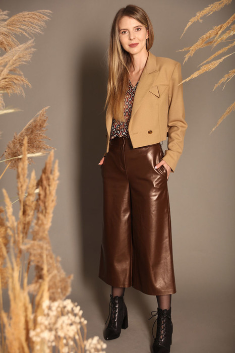 Тренд 2022 года - стильные брюки - кюлоты. Кюлоты из ткани «под кожу» замечательно вписываются в повседневный «кэжуал», подходят в качестве офисного  или вечернего наряда. Используя данную модель брюк от LM в своём гардеробе, можно создать очень удачные образы, комбинируя их с различными вариантами верха, а также обуви.