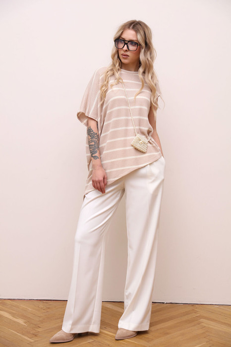 Комплект 2ка, состоящий из трикотажного джемпера и брюк. Джемпер свободного силуэта cо спущенным плечом. Круглый вырез горловины. Низ блузки ассиметричный , удлинён с одной стороны. Брюки широкого объема, прямого силуэта. На передних половинках брюк заутюжены стрелки, переходящие в складки по линии талии. На задних половинках также заутюжены стрелки. В боковых швах расположены карманы. Застежка-гульфик. Пояс отрезной, притачной. В задней части пояса вставлена эластичная тесьма (резинка). На пояс настрочены шлевки. Выступающая часть пояса застегивается на петлю и крючок. СОВЕТ ОТ СТИЛИСТА: нежный образ отлично подчеркиваю аксессуары с жемчугом. Для кэжуал образа обуйте бежевые или белые лоферы и вместительную сумку-шоппер.