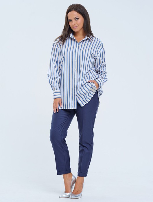 Комплект 2ка, состоящий из рубашка и брюк. Рубашка женская большого объема, прямого силуэта. На детали спинки расположена двойная кокетка, переходящая на деталь полочки. Под кокеткой на спинке встречная складка. Воротник рубашечный отложной на стойке. Застежка планка центральная на прорезные петли и пуговицы. Линия плеча спущенная, рукав рубашечный, длинный. В нижней части рукава заложены складки, заканчивается манжетой с двумя прорезными петлями и пуговицами. Низ блузки разноуровневый: спереди короче, сзади длиннее. Удобные повседневные брюки из лёгкой ткани с вискозой в составе. Брюки свободного прилегания по бедрам и зауженные к низу. Пояс на эластичной тесьме с кулисой и втянутым шнурком. Вход в карман фигурный, наклонный к боковому шву.