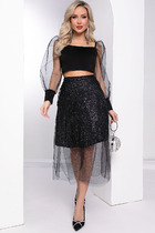 Роскошный костюм не оставит вас без внимания окружающих! Эффектный топ с объемными рукавами из сетки, которые можно спустить и подчеркнуть эстетику ключиц и плеч. По низу рукава манжет. Изящная пышная юбка на завязках из сетки с мерцающим принтом на подкладе подчеркнет вашу легкость и изящность.