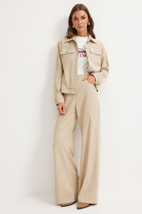 Брюки прямого силуэта расширенные книзу из костюмной ткани. По верху притачной пояс с застежкой на петлю и пуговицу и шлевками для ремня. На передних половинках обработаны карманы и застежка молния в среднем шве. На задних половинках кокетка и накладные карманы. На кармане дизайнерская вышивка. По поясу задних половинок брюк резинка. Обращаем ваше внимание, что фурнитура может отличаться от фото.