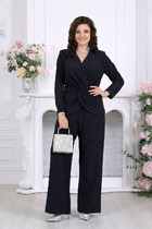 Элегантный комплект, состоящий из блузы и юбки, выполненных из мягкой костюмной ткани. Блуза полуприталенного силуэта со спущенным рукавом и отложным воротником. По спинке в средний шов вставлена молния. Юбка классического кроя, заднее полотнище со средним швом, застегивается на потайную молнию. Шов переходит к низу в шлицу. Длина блузы от плечевого шва 56 см. Длина рукава 51 см. Длина юбки 47 см