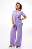 Стильный комплект из жакета и брюк. Жакет двубортный прямого кроя, на подкладке, слегка укорочен. Классический воротник и застежка на пуговицы создают стильный и универсальный силуэт, который легко комбинируется как с брюками прямого кроя , так и с юбкой. Рукав втачной. Жакет дополнен отделкой из рогожки бирюзового цвета, что придает образу уникальность. Брюки прямого кроя с притачным поясом, дополненным эластичной тесьмой. Посадка средняя. Застежка гульфик на молнию и пуговицу. Дополнены функциональными боковыми карманами. Длина жакета от плечевого шва 57см. Длина рукава 60см. Длина брюк по боковому шву 104см.