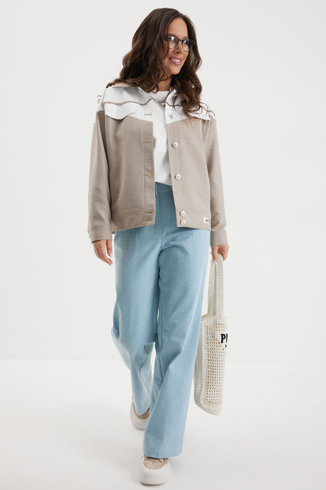 Стильный комплект из куртки и джинсовых брюк. Куртка прямого рубашечного кроя, на подкладке, с центральной застежкой на красивые пуговицы. Горловина обработана отложным воротником. Рукав полной длины с притачной манжетой дополненной застежкой на пришивную пуговицу. Выполнена из двух видов ткани: костюмной ткани с редкими мерцающими пайетками и плащевой ткани.  Куртка дополнена удобными боковыми карманами. Джинсы прямого классического кроя с застежкой гульфик на пуговицу и металлическую молнию. Посадка средняя. Дополнены удобными боковыми и задними карманами. Длина куртки от плечевого шва 62см.  Длина рукава 60см.  Длина брюк по боковому шву 105см.