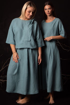 Стильный летний комплект из блузы и брюк, выполненный из ажурного трикотажного полотна в сочетании с легкой однотонной тканью. Блуза свободного кроя с центральной застежкой на молнию. Горловина обработана капюшоном. Блуза с удлиненной спинкой. Легкие и дышащие брюки-алладины свободного объемного кроя выполнены из ажурного трикотажного полотна. Дополнены притачным поясом с эластичной тесьмой. Удобные боковые карманы придают еще большего комфорта. Брюки имеют подкладку-шортики телесного цвета. Длина блузы по переду 70см, по спинке 86см. Длина рукава 35см. Длина брюк по боковому шву 96см.