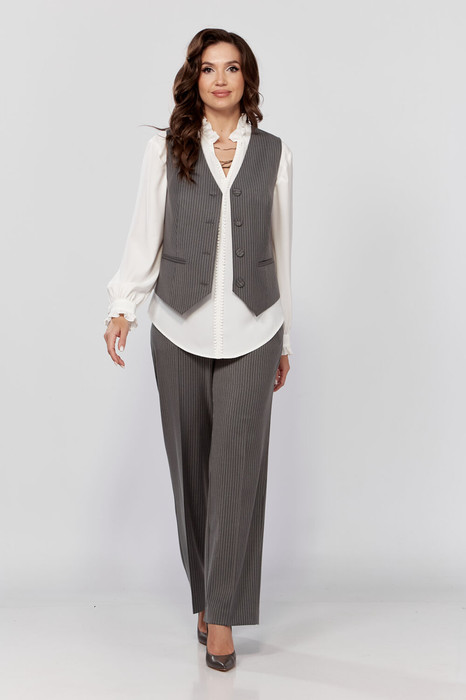 Жилет полуприлегающего силуэта на полной подкладке и застежкой на пуговицы. По переду прорезной карман, сзади - хлястик с застежкой на 2 пуговицы.