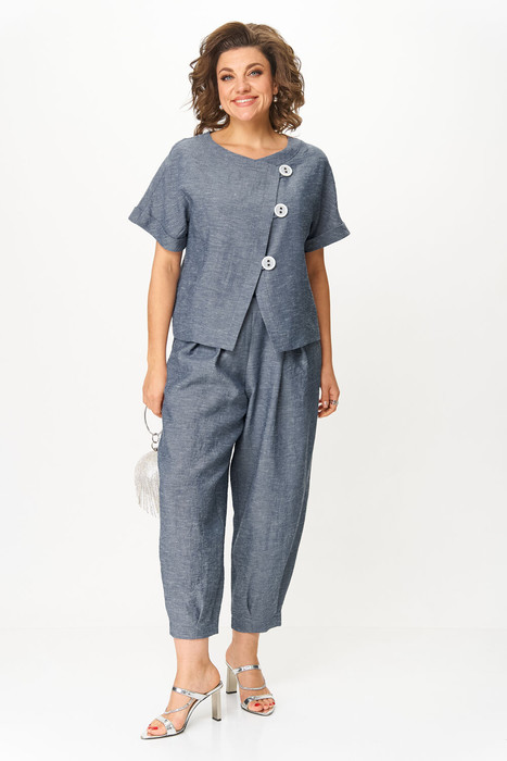 Универсальный и удобный женский брючный костюм для любого повода ,из мягкого материала с эффектом легкой мятости ,что предает шарм изделию . Жакет свободный укороченный с цельнокроенным рукавом длиной до локтя, по низу с отворачивающимся манжетом. Перед жакета с ассиметричной косой застежкой на навесные петли с пуговицами. Брюки-шаровары длиной 7/8, по верху с поясом на резинке. Имеются боковые карманы в швах. Также по талии (переда) двухвстречные складки, по низу передних и задних половинок односторонние складки, придающие пышность брюкам. Комплект смело сочетается с любой обувью. Длина жакета по спинке 57 см, длина рукава от горловины 33 см. Длина брюк по боковому шву 95 см, по шаговому 64 см. Изделие подойдет на рост 170 см.