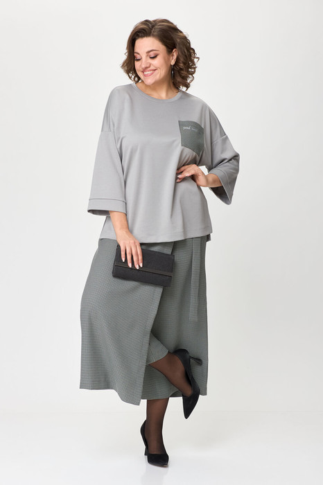 Этот костюм для женщин сочетает в себе стиль и комфорт, идеально подходя для осеннего времени года. Комплект состоит из брюк-кюлотов с элегантным запахом и трикотажного джемпера. Брюки-кюлоты выполнены из брючной ткани в мелкую клетку. Изделие свободной посадки с укороченными широкими штанинами, чуть выше щиколотки. Притачной пояс с резинкой поверху, запах фиксируется поясом на полукольца. Джемпер имеет свободный крой с карманом на передней части, гармонирующим с цветом брюк, рукав спущен, по бокам разрезы, благодаря чему его с легкостью можно носить как навыпуск, так и заправленным. Костюм женский может стать основой вашего делового или офисного образа, придавая ему нотки классики и строгости. Эта одежда подходит не только для рабочих встреч в офисе, но и будет уместна в повседневной жизни, благодаря своей универсальности и комфорту. Брючный комплект можно комбинировать с различными вариантами обуви разных стилей — от строгих туфель до более повседневных ботинок. Длина джемпера по спинке 68 +/-1 см, длина рукава 58 +/-1 см. Длина брюк по боковому шву 92 см, шаговому — 60 см. Изделие подойдет на рост 170 см.