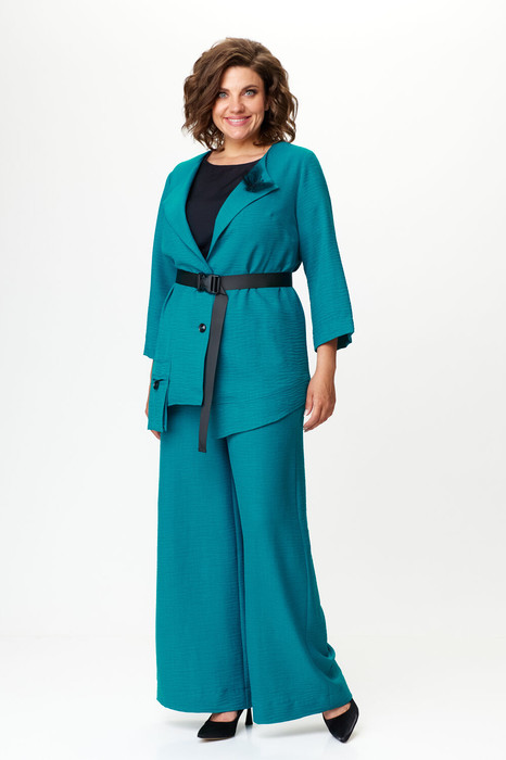 Универсальный женский брючный костюм для повседневной носки, а также торжественных мероприятий, выполнен из однотонного костюмного материала средней плотности. Жакет удлиненный с ассиметричным низом, распашной с раскладным бортом и застежкой на петли-пуговицы. Спинка с центральным швом. Рукав втачной одношовный. По правой стороне переда настрочной карман-книжка. Жакет украшен съемной брошью и дополняется съемным поясом на застежке-карабине. Длинные брюки-палаццо с карманами в боковых швах. Пояс притачной на резинке. Оба изделия отлично сочетаются между собой и могут легко создавать интересные комбинации с другими изделиями Вашего гардероба. Под жакет можно надеть любой топ или джемпер, дополнив образ. Длина жакета по спинке 79 см, длина рукава от плечевого шва 50 см. Длина брюк по боковому шву 113 см +-1 см, по шаговому 79 см +-1 см. Изделие подойдет на рост 170 см.