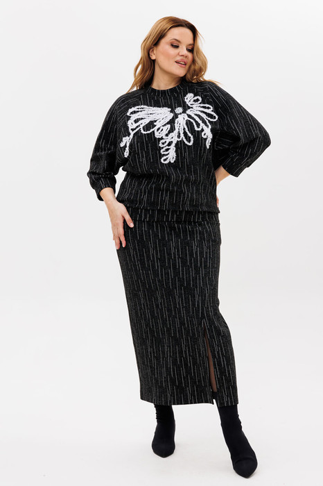 Универсальный и удобный женский юбочный комплект. Данный комплект отличный вариант как для повседневной носки, так и для торжеств. Изделие состоит из джемпера и длинной юбки. Джемпер свободного кроя выполнен из плотного трикотажа. По переду украшен вышивкой, благодаря чему изделие смотрится нарядно. Горловина круглая, рукав реглан "летучая мышь". Низ и рукава на манжете из основной ткани. Прямая удлиненная юбка, по переду с рельефом и разрезом по низу. Изделие на притачном поясе с резинкой и двумя функциональными карманами в боковых швах. Благодаря своей универсальности этот комплект займет важное место в вашем осенне-зимнем гардеробе. Длина джемпера по спинке 65 см (±1 см), длина рукава от горловины 62 см. Длина юбки по боковому шву 92 см. Изделие подойдёт на рост 170 см.