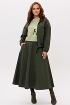 Комплект женский полуприлегающего силуэта. Жакет без подкладки с центральной застежкой на 4 петли и пуговицы. По правой полочке накладной карман и декоративная печать. Спинка с талевыми вытачками. Рукав втачной одношовный. Юбка на подкладке с застежкой в среднем шве заднего полотнища. По переду имитация запаха. Верхний срез обработан обтачкой. Длина жакета 58 см, длина рукава 22 см, длина юбки 67 см