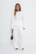Костюм женский состоящий из жакета и брюк. Жакет без подкладки, свободного силуэта, застегивается на двубортную застежку на 2 кнопки. Воротник "шаль". Рукава цельнокройного покроя с подрезом и отворачивающимся манжетом. По переду накладные карманы. Брюки прямые, прояс на резинке, карманы в боковых швах.
