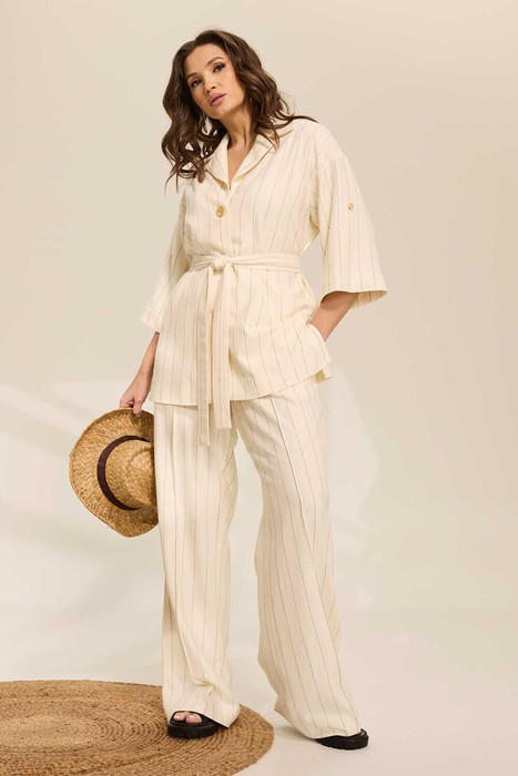 Костюм женский, состоит из блузы и брюк. Блуза прямого силуэта. Застежка центральная на 2 петли-пуговицы. воротник пиджачного типа. Блуза без карманов. Рукав внизу на пате, в боковых швах блузы - разрезы. Брюки прямые на резинке со шнурком, свободные, прямые, с боковыми карманами. Дополняет костюм съемный пояс.