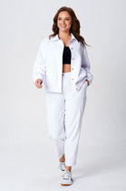 Комплект женский, из разных по фактуре тканей, состоящий из джемпера на трикотажной подкладке и брюк палаццо. Джемпер прямого силуэта, рукав втачной, одношовный. Горловина, низ рукава и низ изделия обработанны притачной трикотажной бейкой. Брюки палаццо, на притачном поясе с резинкой и тесьмой. У брюк - боковые карманы.
