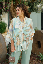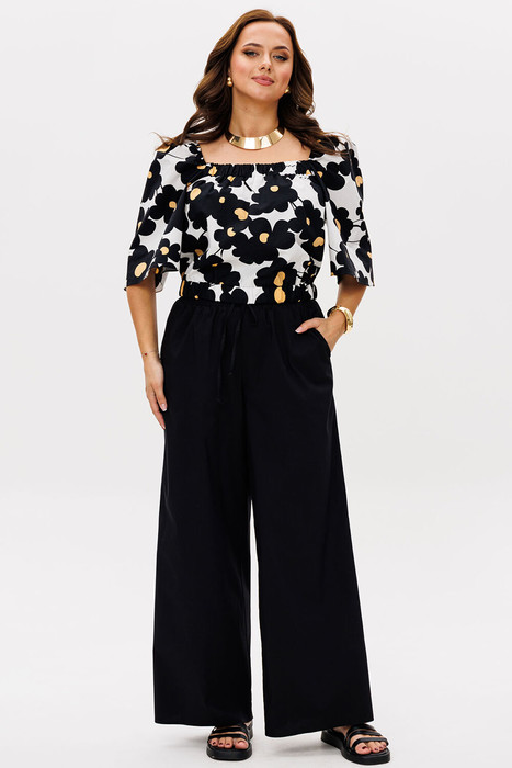 Костюм женский, состоит из блузы и брюк. Рукав у блузы - реглан, со сбокой по окату. Рукав расширенный до линии локтя. По переду и спинке блузы - притачная планка с резинкой. Низ блузы с притачным поясом и резинкой. Брюки на резинке, свободные, прямые, с карманами в боковых швах.