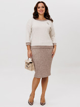 Костюм женский, состоящий из блузы и брюк. Блуза прямого силуэта, с разрезами по бокам. Рукав цельнокроеный, заканчивается притачной манжетой. Горловина V-образная с притачной планкой по линии переда, спинки и рукава. Головина на завязке. Дополнением служит пояс. Брюки по силуэту с легким клешем от колена, по передним половинкам по центру застрочен защип. Карманы боковые накладные. Брюки с застежкой на молнию. Притачной пояс застегивается на петлю-пуговицу и с резинками по бокам. Модель без подкладки.