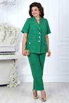Костюм женский полуприлегающего силуэта состоит из жакета и юбки. Жакет с втачными рукавами и отложными манжетами. Перёд с талевыми вытачками и кокетками, в которые вставлены фигурные клапаны на застёжках на металлических пуговицах. Жакет застёгивается на металлические пуговицы. Горловина круглая. По спинке кокетка и центральный шов. Юбка, зауженная к низу, с высокой посадкой, с цельнокроеным поясом. Перёд с фигурными подрезами и карманами. По заднему полотнищу фигурные подрезы, центральный шов и застёжкой на потайную тесьму-молнию. По спинке от бокового шва до подреза сверху вставлена эластичная тесьма.  Юбка на тонкой трикотажной подкладке.  Комплект дополняет пояс на пуговицах.  Украшает костюм двойные отделочные строчки