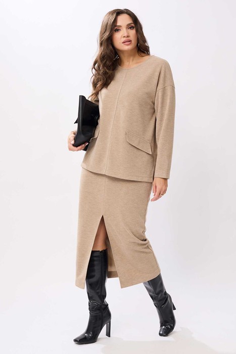 Костюм женский, состоящий блузы и юбки. Блуза прямого силуэта. Горловина круглая, обтачная,, спинка с центральным швом. Перед с центральным швом и настроченными клапанами. Рукава спущенные. Юбка зауженная к низу, на резинке и завязке. Перед со средним швом и разрезом. Юбка на подкладе.