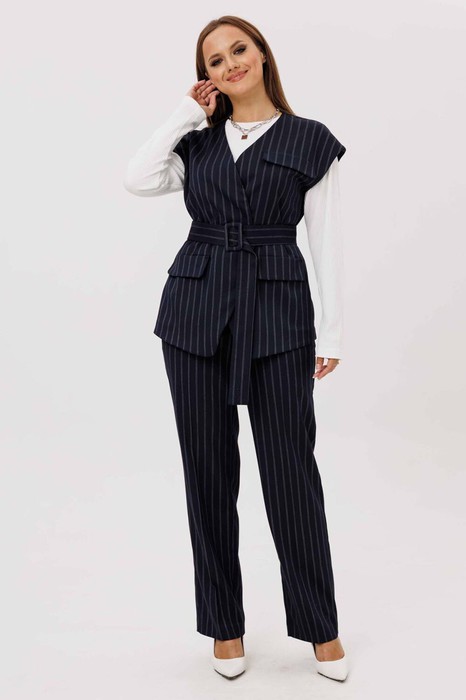 Комплект женский, состоящий из жилета и брюк. Жилет полуприлегающего силуэта, без подкладки. Плечо спущенное.Вырез V - образный, с воротником стойкой. По переду иммитация карманов с клапаном. Центральная застежка на пришивные кнопки.  Спинка со средним швом и вытачками. Джемпер без вытачек. Рукава втачные, одношовные, длинные. Ткань в рубчик. Прямой крой. Брюки прямого силуэта, слегка зауженные к низу. Пояс частично на резинке (по бокам), с шлевками для ремня. Застежка на гульфик с молнией и пуговицей. По бокам карманы с косым входом. Материал костюма костюмный, средней плотности, с гладкой фактурой. Без подкладки. Дополняет модель широкий пояс.
