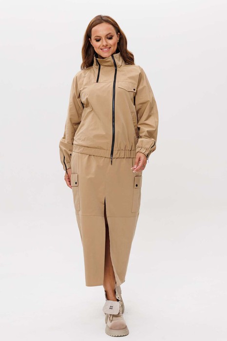 Костюм женский состоит из жакета и юбки выполнены из плащевой ткани. Жакет свободный с цельнокроеными рукавами, без подкладки, по низу притачная планка, в которую продета резинка. По переду горизонтальный подрез, прорезные карманы с листочкой , клапан с кнопкой, молния и застёжка на тесьму молния. Воротник стойка. По низу рукава резинка и застёжка небольшая молния. Юбка прямого силуэта на притачном поясе на резинке с фиксирующей затяжкой. По переду центральный шов заканчивается разрезом. Горизонтальный подрез по переду и спинке. По бокам большие накладные карманы с клапанами на кнопках. Юбка на подкладке.