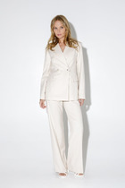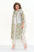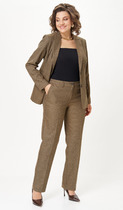Элегантный женский костюм классического кроя. Комплект состоит из жакета и юбки-карандаш. Жакет полуприлегающего силуэта, спинка со средним швом, заканчивающимся шлицей. По конструкции предусмотрен воротник с лацканами. Застежка на две пуговицы. В передней части предусмотрены два прорезных кармана. Рукава втачные, двухшовные, со шлицей на пуговицах. Юбка длиной миди, слегка зауженная к низу. Застежка на молнию в центральном шве. В левой боковой части юбки размещен разрез от колена до низа, что обеспечивает свободу движения и добавляет элегантности. Жакет и юбка на подкладке. Жакет дополняет декоративная съемная брошь.