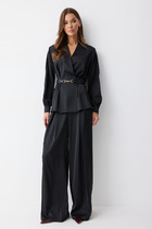 Элегантный женский костюм классического кроя. Комплект состоит из жакета и юбки-карандаш. Жакет полуприлегающего силуэта, спинка со средним швом. По конструкции предусмотрена центральная застежка на 8 пугович. воротник стоячий отложной. Рукава втачные, со сборкой по окату. Юбка длиной миди, слегка зауженная к низу со шлицей. Пояс юбки на обтачке, застежка на тесьму-молнию, пояс частично на резинке по бокам. Жакет и юбка на подкладке.