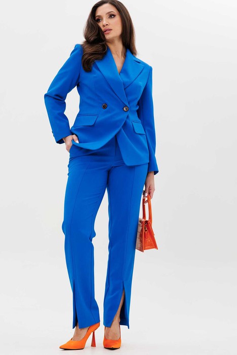 Костюм женский, состоящий из жакета и брюк. Жакет полуприлегающего силуэта, с двубортной застежкой и фигурной линией полузаноса.  карманы функциональные «в рамку» с клапаном. По переду талевые вытачки. Спинка с фигурными рельефами от проймы до низа и центральным швом. Рукав двухшовный втачной со шлицей по локтевому шву. Жакет на подкладке. Брюки, зауженные к низу, на поясе, застежка на молнию и крючек. Брюки с функциональными боковыми карманами. По передним половинкам брюк – шов, со шлицей в низу.