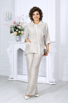 Комплект женский состоит из блузы и юбки. Блуза со спущенными плечами.  По переду и спинке горизонтальные кулисы. Горловина V-образная. По бокам небольшие разрезы. Юбка, слегка расклешённая к низу, на обтачке, без подкладки. По переду рельефы от талии до низа, заканчивающиеся шлицами с разрезом. По заднему полотнищу юбки талевые вытачки, центральный шов и застёжкой на потайную тесьму-молнию.