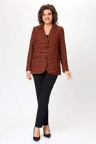 Костюм женский полуприлегающего силуэта состоит из жакета и юбки, выполнен из костюмной ткани различной по дизайну. Жакет укороченный, по переду подрез, клапаны, талевые вытачки и застёжка тесьма молния. Спинка с подрезом и талевыми вытачками. Горловина круглая. Рукава двух шовные втачные на манжете. Жакет на полуподкладке. Юбка, зауженная к низу, с цельнокроеным поясом. По переду прорезные карманы с листочкой. Застёжка потайная тесьма молния в центральном шве спинки, который заканчивается шлицей с разрезом. Юбка на трикотажной подкладке.