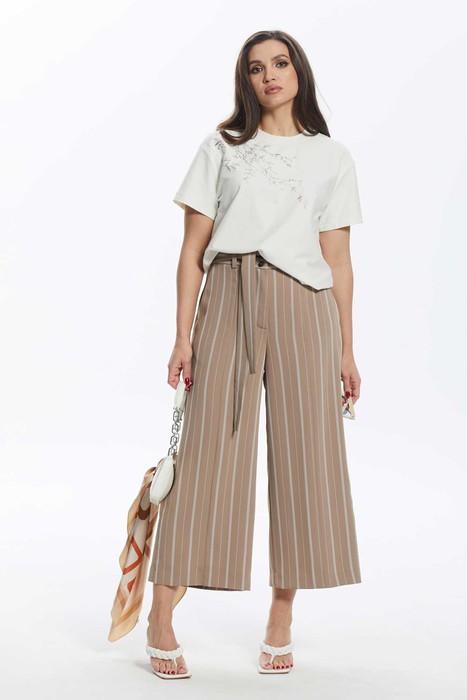 Брюки широкие прямые с высокой посадкой(кюлоты) до середины голени. Брюки на притачном поясе с функциональными боковыми карманами и застёжкой на потайную молнию с гульфиком и откоском. По спинке талевые вытачки. Дополнением служит пояс.