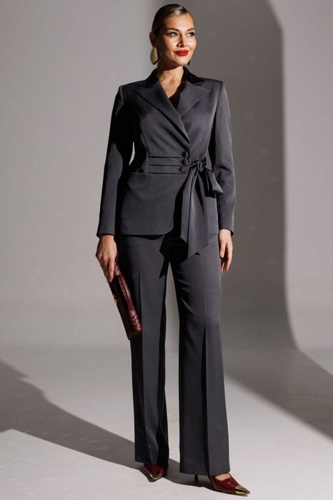 Жакет полуприлегающего силуэта с двухбортной застежкой на три обтяжные из атласной ткани пуговицы и одной потайной. Край борта овальной формы, что придаёт жакету утонченность. По переду обработаны фигурные рельефы из проймы, также имеется горизонтальный подрез,в котором расположены карманы. На правой центральной части полочки - три складки, параллельные подрезу. Дополнительно с левой стороны завязывается атласный бант,что придает нарядность и особый шарм. Одна часть банта крепиться на пуговицу, другая в боковом шве. Спинка со средним швом и вертикальными рельефами из проймы. Воротник пиджачного типа из атласной ткани с пикообразными лацканами. Рукава двухшовные, со шлицей в локтевом шве на одну пуговицу, также обтяжную из атласа. Жакет на подкладке. Брюки классические,со стрелками,с притачным поясом-сзади частично на резинке для удобства и комфортной посадки. На поясе имеются пять шлёвок. На передних половинках присутствуют карманы. Застёжка на молнию и пуговицу. Костюм выполнен из качественной костюмной ткани с отделкой из атласа.