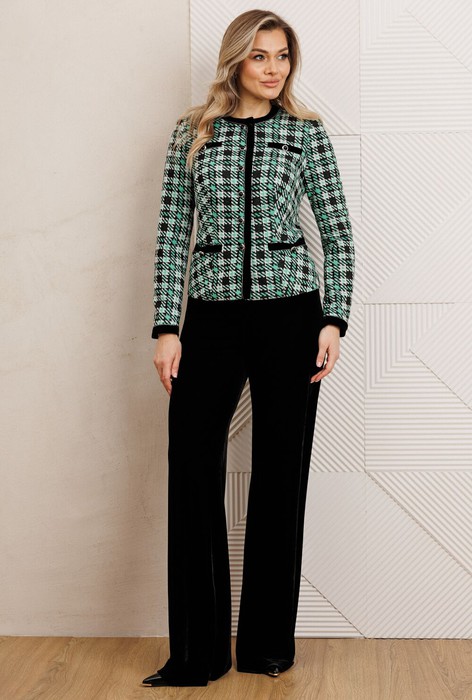 Брючный костюм в стиле Шанель представляет собой элегантное сочетание классики и современности. Жакет выполнен из трикотажного полотна с актуальным принтом «гусиная лапка», имеет полуприлегающий силуэт и центральную застежку на пуговицы. Спинка оформлена средним швом и талиевыми вытачками, что обеспечивает идеальную посадку. Передняя часть также украшена талиевыми вытачками, а округлая горловина подчеркивает женственность образа. Функциональные карманы с листочками расположены внизу, в то время как имитация карманов в верхней части переда добавляет изюминку. Листочки на карманах и планка горловины выполнены из бархата с отделкой по краям, создавая контраст текстур. Рукава втачные, двухшовные, с планкой по низу, также отделанной бархатом. Жакет на подкладке, что обеспечивает комфорт при носке. Брюки палаццо из бархата имеют стильные широкие штанины и удобную резинку на поясе, что делает этот костюм идеальным выбором как для деловых встреч, так и для вечерних выходов.