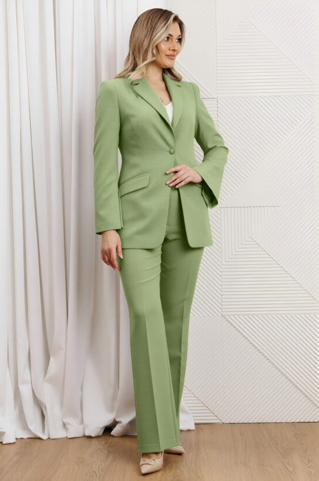 Деловой комплект, состоящий из жакета и брюк. Жакет - воплощение стильной трансформации. Его классический крой выполнен из безупречной костюмной ткани, но в деталях скрывается своенравный характер. Жакет полуприлегающего силуэта. Модель отличается аккуратным кроем и стильными деталями. На передней части жакета обработаны вертикальные рельефы, идущие от проймы до уровня кармана и от кармана до низа, что придаёт силуэту выразительность и стройность. Воротник пиджачного типа добавляет классической элегантности. Застёжка центральная бортовая на петлю-пуговицу. Карманы в рамке с клапанами, гармонично расположены на передней части жакета. Спинка с центральным швом и вертикальными рельефами, идущими от проймы. Рукава двухшовные с отрезной деталью по окату и разрезами внизу добавляют свободы движению и делают модель более интересной. Жакет на подкладке. Брюки с высокой посадкой, по линии талии – притачной пояс, в боковых швах резинка. Застежка на молнию.