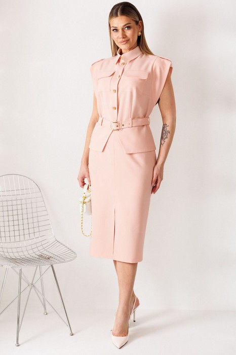 Элегантный костюм, состоящий из жакета без рукава и юбки. Жакет с отрезной баской по переду и спинке. Без рукавов, но с декоративными "крылышками" по проймам. Застежка центральная на пуговицы. Воротник с отрезной стойкой. По линии плеча погоны, которые застегиваются на пуговицу. По переду нагрудные и талиевые вытачки. По спинке средний шов и талиевые вытачки. По переду накладные карманы с клапанми. По линии талии шлевки и пояс, которые застегивается на пряжку. Пояс съемный. Юбка прямая, зауженная к низу. По переднему полотнищу разрез. Пояс с резинками по бокам. Застежка на потайную молнию и пуговицу. Юбка на подкладке.