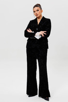 Туника полуприлегающего силуэта . Спинка со средним швом и талиевыми вытачками. По переду выполнены нагрудные вытачки, которые выходят из боковых швов. Низ туники ассиметричной формы. Вырез горловины округлой формы. Брюки прямые, слегка зауженные к колену. На притачном поясе сзади с резинкой. Брюки с карманами. Застежка на тесьму молнию. Костюм декорирован съемной брошью.