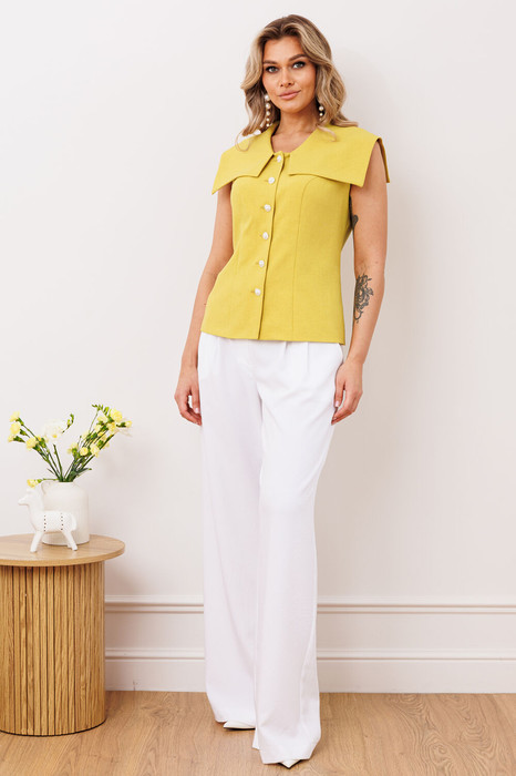 Яркий комплект: жилет с воротником "апаш" и брюки "палаццо". Этот смелый и элегантный комплект сочетаем в себе дерзость и женственность, создавая образ, который невозможно игнорировать. Жилет приталенного силуэта с центральной застежкой на петли пуговицы. Вертикальные рельефы. Главная акцентная деталь - шикроий воротник "апаш". Спинка с центральным швом и рельефами. Брюки "палаццо" создают воздушный силуэт. Высокая талия визуально удлиняем ноги. Брюки на притачном поясе, с двумя складками по переду. Боковые карманы. Сзади резинка. Молния в среднем шве. Жилет на подкладке.