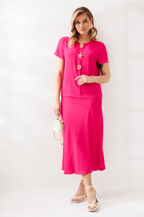 Блуза прямого свободного силуэта. По переду отделочная складка с декором в виде 3-х съемных брошей. По спинке средний шов. Горловина округлой формы. Рукава втачные, одношовные.