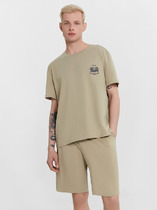 Костюм мужской из плотного гладкокрашеного трикотажного полотна "кулирка", состоящий из футболки и шорт. Футболка - свободного покроя, с удлиненными плечевым и швами, короткими втачными рукавами и горловиной овальной формы, обработанной втачной планкой. В нижней части переда слева настрочен декоративный элемент прямоугольной формы. По горловине проложена отделочная строчка. Шорты - классического покроя, на притачном поясе с эластичной тесьмой внутри и карманами в боковых швах. Для регулирования степени прилегания шорт по талии в пояс вставлен шнурок, продетый через две петли в центре пояса.