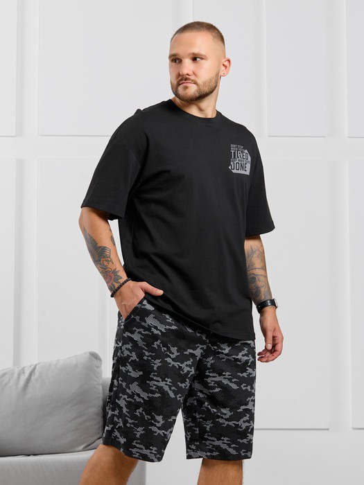 Костюм мужской, состоящий из футболки и шорт. Футболка однотонная с принтом на груди; модель свободная, со спущенной линией плеч. Шорты из полотна с набивным рисунком эксклюзивного дизайна, с боковыми карманами с обтачными входами, на притачном поясе с отстроченной эластичной тесьмой.